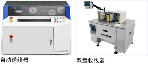 首先,準備同軸線纜。放線模塊PF-6S(下圖),可以承載350KG的同軸線軸、自帶剎車功能、10M以上的線緩存、無線檢測和打結(jié)報警等功能。斷線模塊JQ-SC,將校直、送線、測量和斷線完美融合到一起,保證長度精度的同時斷面完全符合IPC 620的外觀標(biāo)準要求。對于長線需要圈線時,單盤BS-40和雙盤DC-60(下圖)標(biāo)準收線器有效提升生產(chǎn)效率,尤其雙盤的收線器效率比單盤提升了50%以上的圈線效率。