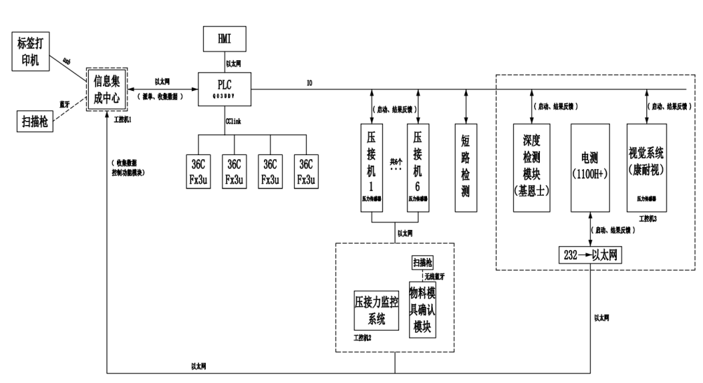 信息化軟件系統(tǒng)實現(xiàn)了MES自動派單、產(chǎn)品自動標(biāo)識、機器參數(shù)自動調(diào)節(jié),生產(chǎn)過程實時監(jiān)控并記錄產(chǎn)品狀態(tài),海量數(shù)據(jù)存儲,產(chǎn)品追溯、物聯(lián)網(wǎng)組網(wǎng)等功能,系統(tǒng)架構(gòu)主要包括了信息集成中心、主控PLC控制中心、壓接力監(jiān)控系統(tǒng)、物料模具確認模塊、導(dǎo)通檢測、深度檢測模塊、電測系統(tǒng)、視覺系統(tǒng)等。主控PLC是整個FAKRA流水線的控制中心,控制載具工位大循環(huán),報警信息收集,協(xié)調(diào)每個工站流水作業(yè)工作,所有的工站的工作狀態(tài)都記錄在主控PLC中。信息集成中心是整個FAKRA流水線的數(shù)據(jù)中心,包含生產(chǎn)任務(wù)管理、配方管理、標(biāo)簽生成模塊、物料模具確認模塊、線纜加工狀態(tài)監(jiān)控、工站狀態(tài)監(jiān)控、數(shù)據(jù)收集、數(shù)據(jù)統(tǒng)計等,系統(tǒng)將實時與主PLC進行通訊,以及與每個檢測控制單元系統(tǒng)進行實時通訊,同步記錄每條線纜的加工狀態(tài)及工站的狀態(tài)。